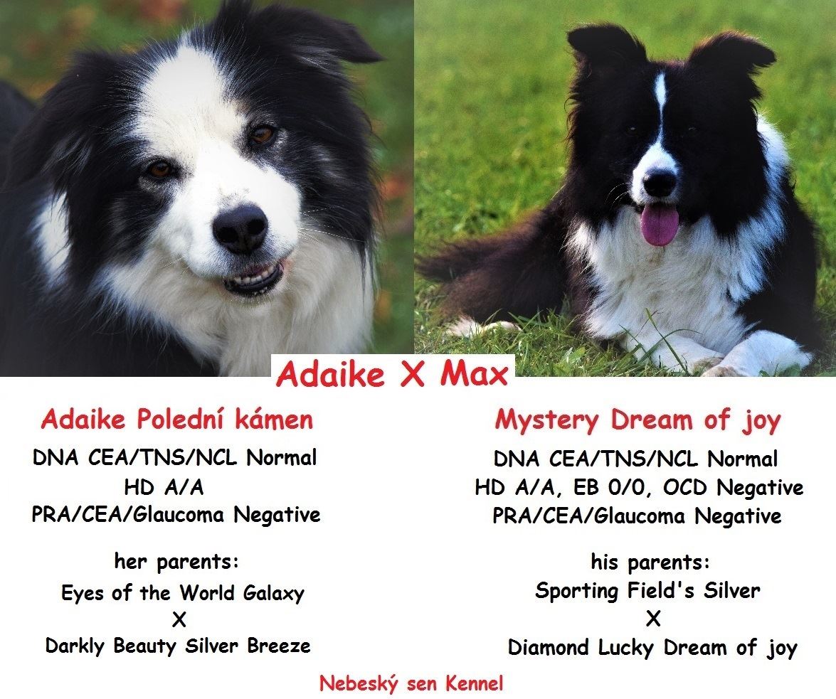 01.06.2016 20:27Dne 27.5.2016 se v naší CHS Nebeský sen narodil zahraničně sportovně nadějný vrh "M" . Narodila se jedna holčička ve zbarvení černobílá, 1 kluk ve zbarvení černá s pálením a jeden klučina zatím v barvě seal-bílá. Uvidíme jak se vybarví :) Štěňátka budou především vhodná pro zájemce o sport, budoucí chov či jako domácí společník.